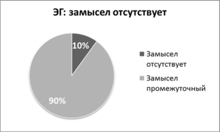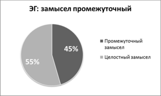 Дети с первоначально промежуточным замыслом в рисунке оказались неоднородными в продвижении по уровням замысла. Часть детей перешла к целостному замыслу (54.5%), а часть детей осталась в рамках промежуточного (45.5%). У всех детей ЭГ произошли качественные изменения в развитии графической деятельности.