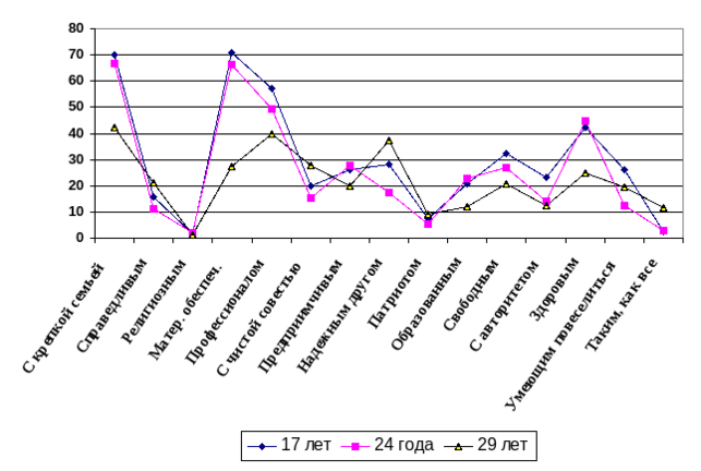 Сравнительный анализ жизненных планов 17 – летних и 24-летних респондентов и оценок реальных результатов их реализации у 29- летних (какой я есть), показывает, что наибольшие расхождения отмечаются по ведущим позициям: материальная обеспеченность, крепость семейных отношений, физическое здоровье и достижение профессионализма в своем деле.