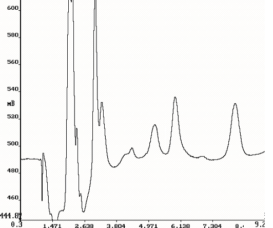 Рис. 2. Хроматограмма смеси гидразинов (СНДМГ=0,001 мг/л) после on-line концентрирования на колонке Nucleosil 10 SA (4х50 мм). Разделяющая колонка Nucleosil 10 SA (4х100 мм) Элюент: 50 мМ ацетата аммония (рН 5,4). Скорость подачи элюента 1мл/мин.