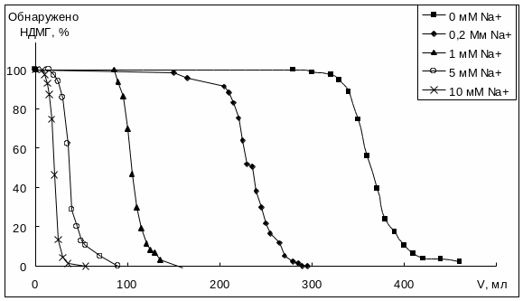 Для моделирования такого эффекта изучили влияние присутствия натрия с содержанием 0,2-10 мМ на результаты концентрирования НДМГ. Сравнение диаграмм сорбции НДМГ в присутстии 0,2-10 мМ солей натрия на колонках Nucleosil SA разного размера (рис. 4 и 5) подтверждает конкуренцию катионов натрия с катионами НДМГ за взаимодействие с сульфогруппами катионообменника.