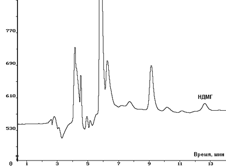 В таблице 6 представлены основные параметры хроматографического определения НДМГ с использованием 100 и 150 мМ ацетата аммония. Из данных таблицы 6 видно, что 100 мМ раствор ацетата аммония обеспечивает больший коэффициент емкости по НДМГ, и такой состав подвижной фазы предпочтительно использовать для более эффективного разделения компонентов пробы.