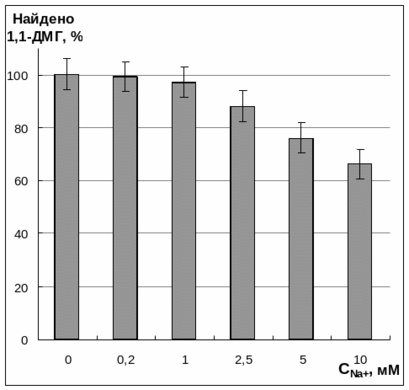 Рис. 6. Контроль правильности определения НДМГ методом «введено-найдено» при различных концентрациях Na+. Концентрация НДМГ 0,005 мг/л. Колонка Nucleosil 10 SA 4×50 мм.