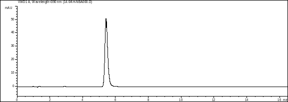Рис. 9. Хроматограмма гидразона, полученного в результате реакции дериватизации с НДМГ с концентрацией 2,5 мг/л. Элюент 50 мМ раствор ацетата аммония (рН 5,35) и 60% ацетонитрила. Детектор спектрофотометрический, λпогл.=390 нм.