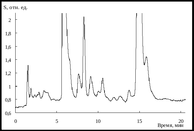 Рис. 24. Хроматограмма диметилгидразона коричного альдегида (СНДМГ = 50 мг/л). Колонка Nucleosil 5-C18, 4.6 × 150 мм. Элюент: 55% 0.05M CH3COOH/45% ACN. Скорость потока 0.7 мл/мин. Масс-спектрометрический детектор.