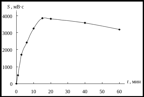 Рис. 23. График зависимости площади хроматографического пика производного НДМГ от времени нагрева НДМГ с коричным альдегидом.