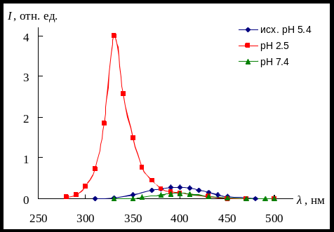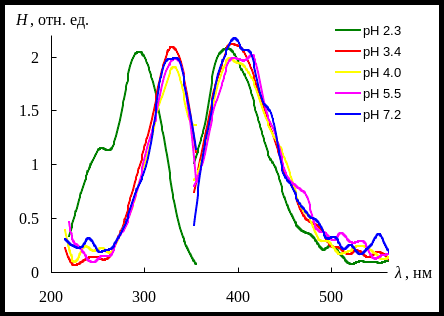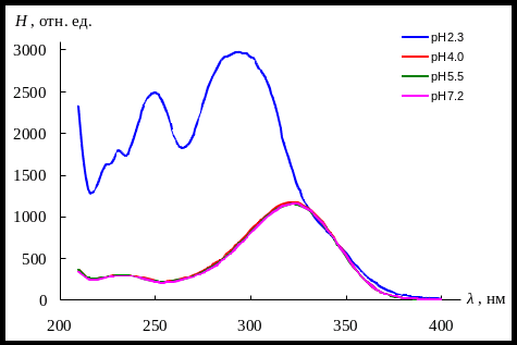 Изучение влияния рН элюента на положение максимумов возбуждения и эмиссии флуоресценции показало аналогичные зависимости для флуориметрического детектирования: максимум возбуждения флуоресценции сдвинут в коротковолновую область по сравнению с нейтральной формой гидразона, максимум эмиссии при этом остается без изменений (рис. 26).