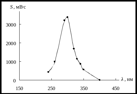 Рис. 21. Зависимость площади хроматографического пика диметилгидразона коричного альдегида от длины волны поглощения. Колонка Nucleosil 5-C18, 4.6 × 150 мм. Элюент: 60% 0.05М Н3PO4/40% ACN. Скорость потока 1 мл/мин.