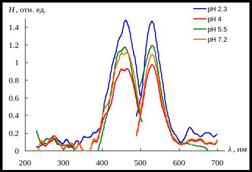 Влияние рН подвижной фазы изучали на примере использования раствора фосфорной кислоты (рН 2.3) и фосфатных буферных растворов (рН 4–7.2). На рис. 43 представлены спектры полощения диметилгидразона, снятые в потоке, при различных значениях рН подвижной фазы. С увеличением рН дипазоне 2.3–7.2 не происходит сдвига максимума поглощения производного, при этом максимальную интенсивность поглощения обеспечивает использование раствора фосфорной кислоты. Все это свидетельствует о том, что максимум поглощения и протонированной и непротонированной формы находится при λ = 460 нм, но протонированная форма обладает большей интенсивностью поглощения.