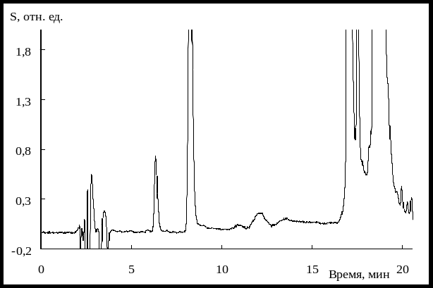 Рис. 45. Хроматограмма диметилгидразона п-ДМАКА (СНДМГ = 0.01 мг/л). Колонка Nucleosil 5-C18, 4.6 × 150 мм. Элюент: 80% 0.05М Н3PO4/20% ACN. Скорость потока 0.7 мл/мин. Спектрофотометрический детектор, λпогл = 460 нм.