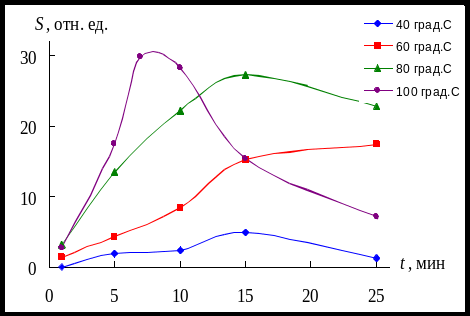 Рис. 41. График зависимости площади хроматографического пика гидразона от времени нагрева НДМГ с п-ДМАКА при разных температурах.