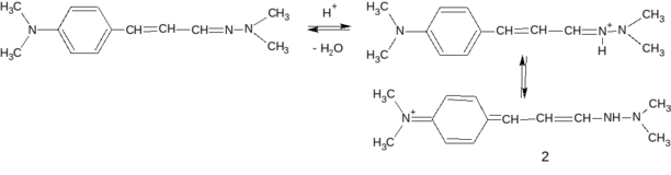Наличие в молекуле п-ДМАКА электронодонорной диметиламиногруппы может изменять поведение продукта его конденсации с НДМГ. По аналогии с ароматическими аминами можно предположить, что на стадии протонирования диметилгидразона коричного альдегида возможно образование двух резонансных структур 1 и 2 [11]: