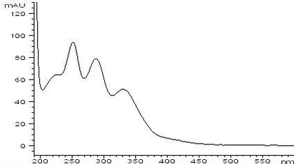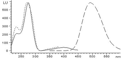 Детектирование НДМГ-НДА возможно проводить только спектрофотометрически, λпогл = 290 нм. Спектр поглощения продукта представлен на рис. 58,в. Согласно [ ] можно предположить, что интенсивность его флуоресценции не достаточна для регистрации сигнала, однако дальнейшие анализы больших концентраций производного НДМГ (до 200 мг/л) также показали отсутствие флуоресцентного сигнала. Вероятно, НДМГ-НДА существует в хроматографической системе в нефлуоресцирующей форме гидразона X (рис. 55,в) с незамкнутым циклом, поэтому детектируется только спектрофотометрическим детектором.