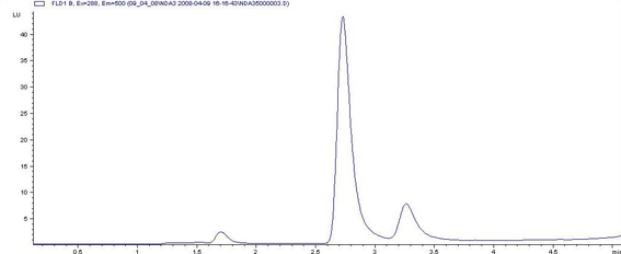 Порядок выхода компонентов смеси соответствует их структуре и форме существования в хроматографической системе: для ММГ-НДА наблюдается наименьшее время удерживания вследствие двойного заряда молекулы его НДА-производного. Времена удерживания состави 3.0, 4.7 и 9.6 мин для ММГ, гидразина и НДМГ, соответственно.