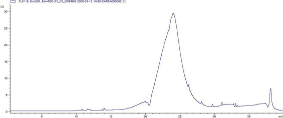 Рис. 59. Хроматограмма НДА-ММГ (СММГ= 20 мг/л). Колонка Zorbax SB-C18, 4.6×150 мм. Подвижная фаза А – ацетонитрил/Б - фосфатный буферный раствор (0.01 М, рН 7.7), градиентное элюирование:0-5 мин 5% А,30 мин 95% А, 35 мин 95% А, 37 мин 5% А, 40 мин 5% А. Скорость потока 1 мл/мин. Флуориметрическое детектирование λвозб. = 288 нм, λэм.= 500 нм. Т = 20 ºС.