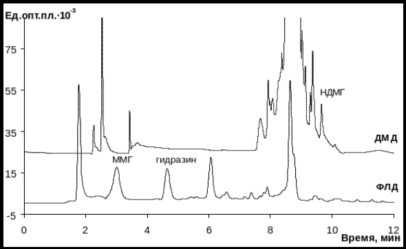 | НДМГ | 200 60 20 нг | 180 ± 30 62 ± 7 19 ± 2 нг | Вода из скважины Речная вода Почвенный отгон |