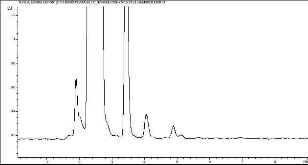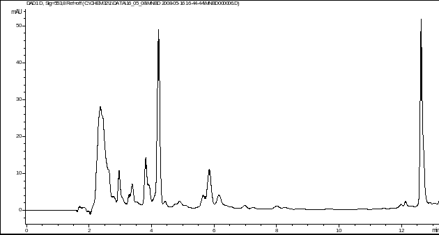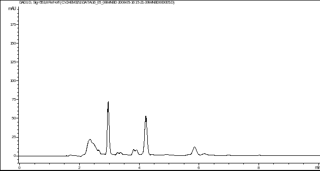 Рис. 77. Хроматограмма MМГ-БФЗ (СMМГ = 50 мг/л). Колонка Zorbax SB-C18, 4.6 × 150 мм. Элюент: 50% 0.1M ацетата аммония, 50% ацетонитрила. Скорость потока 0.7 мл/мин. Масс-спектрометрический детектор.