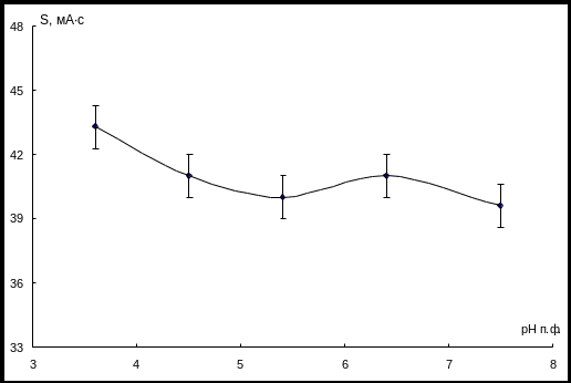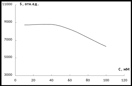 В ходе работы установлено, что изменение концентрации фосфатного буферного раствора в диапазоне 10 - 50 мМ не оказывает влияния на площадь пика производного НДМГ, однако дальнейшее увеличение концентрации ведет к снижению интенсивности сигнала (рис. 80). В качестве рабочего далее использовали 20 мМ фосфатный буферный раствор.