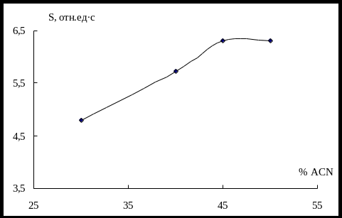 Поскольку интенсивнрость флуоресценции зависит от содержания органического растворителя в подвижной фазе, в работе также изучили влияние этого фактора, варирьируя количество растворителя в допустимых пределах, обеспечивающих разделение компонентов реакционной смеси. Представленная на рис.81 зависимость свидетельствует о необходимости 45-50% содержания растворителя в элюенте. Для дальнейшей работы в подвижную фазу добавляли 50% ацетонитрила.