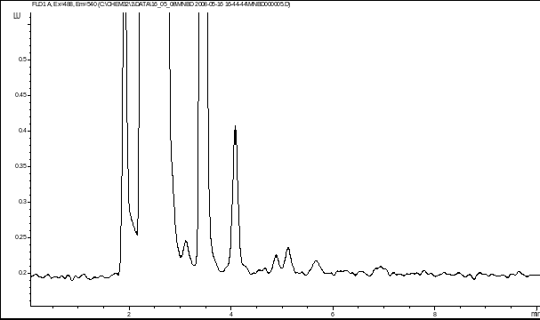 Таким образом, разработан подход определения НДМГ в виде флуоресцирующего производного с 4-хлор-7-нитробензофуразаном. Предел обнаружения НДМГ с использованием метода ОФ ВЭЖХ с наиболее чувствительным флуориметрическим детектированием (lвозб = 488 нм, lэм = 540 нм) составил 3 мкг/л при объеме вводимой пробы 100 мкл.