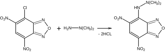 В последнее время для хроматографического и проточно-инжекционного определения аминов и гидразинов используются реагенты на основе бензофуразана. Реакция 4-хлор-5,7-динитробензофуразана (дБФЗ) с 1,1-диметилгидразином в неводных и смешанных средах приводит к образованию окрашенного продукта по схеме (рис.3):