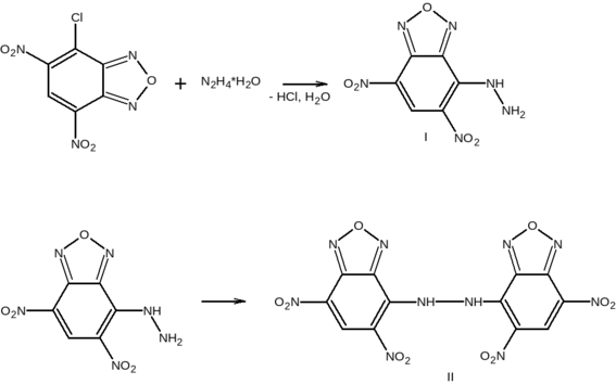 Реакция 4-хлор-5,7-динитробензофуразана с гидразином, схема которой представлена на рис. 4 дает устойчивый продукт с интенсивным поглощением при 640 нм. Изучение условий реакции показало [], что оптимальным является использование водно-органических бинарных смесей, с небольшим содержанием полярного органического растворителя.
