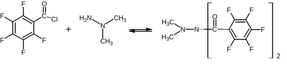 Капиллярная газовая хроматография (ГХ) обладает рядом сложностей при определении гидразинов. Гидразины, как высокополярные соединения, характеризуются специфическими взаимодействиями с силанольными группами сорбента, что приводит к размыванию хроматографических зон. Большие проблемы также связаны с высокой реакционной способностью гидразинов, что ведет к разложению низких концентраций уже в хроматографе. Все это затрудняет прямое определение гидразинов методом ГХ. Поэтому стадия дериватизации является необходимой при газохроматографическом анализе этого класса соединений. Как правило, для этой цели используют альдегиды ароматического ряда, так как образующиеся гидразоны обладают меньшей реакционной способностью и лучше растворимы в органических растворителях (толуол, гексан, бензол), которые используют для дальнейшей экстракции образовавшегося гидразона в органическую фазу. В ходе экстракции равновесие реакции между альдегидом и гидразином смещается в сторону образования гидразона, одновременно происходит смена матрицы с водного раствора на органический растворитель. Кроме того, экстракция — это возможность провести концентрирование раствора образовавшегося гидразона, что позволяет проводить определение очень малых (на уровне мкг/л) количеств НДМГ.