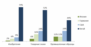 Наибольшее количество заявок поступают в патентные ведомства с целью регистрации товарных знаков (5 588 000 заявок в 2010 г. по всему миру) 87. В области регистрации товарных знаков в 2010 –2011 гг. настоящий бум произошел в Китае, где в 2011 году было подано 1 370 962 заявок, даже США, стоящие на втором месте по количеству поданных заявок на регистрацию товарных знаков, уступают Китаю практически в 2 раза – 787 762 заявок, на третьем месте в 2011 году расположилась Германия с 663 899 заявками.