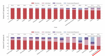 вышеуказанные показатели объясняются не только ежегодным приростом количества заявок в развитых странах (США, Германия, Южная Корея и др.), но во многом, за счет активизации патентной активности в развивающихся странах, главным образом, в Китае (см. рис. 5).