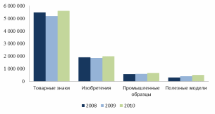 Таким образом, несмотря на экономические последствия финансового кризиса, начиная с 2010 года, наблюдается мировая тенденция интенсивного наращивания компаниями нематериального капитала за счет регистрации товарных знаков, полезных моделей и промышленных образцов. Так согласно отчету ВОИС за 2012 год, количество патентных заявок на объекты промышленной собственности во всем мире выросло на 7,8% с 2009 по 2011 год. В частности, количество заявок на выдачу патентов на полезную модель, промышленный образец и свидетельств на регистрацию товарных знаков