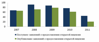 В 2011 г. общий объем зарегистрированных лицензионных договоров увеличился до 1762 договоров, что на 11,7% превышает показатель 2010 г., а показатель 2009 г. — на 34,4% (в 2009 г. — 1311, в 2010 г. — 1504)103. Общее количество зарегистрированных договоров в 2011 г. достигло максимального значения за последние пять лет — 3207 договоров, что на 11,2% превысило показатели 2010 г. и на 35,6% — показатели 2009 г. Наряду с исключительными и неисключительными лицензиями у правообладателя есть право предоставлять открытую лицензию на объекты промышленной собственности, т.е. заключать соглашение с любым заинтересованным лицом о предоставлении права на использование охраняемого объекта патентования. Право предоставления открытой лицензии регистрируется патентным ведомством РФ (Роспатентом) при соблюдении правообладателем определенных условий (подача специальной формы заявления о регистрации открытой лицензии, уплата пошлин) и дает льготный режим уплаты патентных пошлин за подачу и поддержание патента в силе. Но если по
