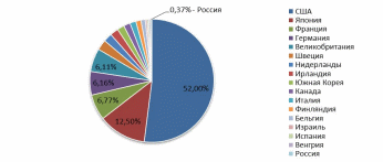 Несмотря на то, что согласно данным Всемирного банка Россия входит в 20-ку стран, лидирующих по показателю поступления лицензионных платежей, ее доля в общемировом объеме ничтожно мала по сравнению со странами, занимающими первые позиции - США (52%), Япония (12,5%) и Франция (6,7%) (см. рис. 7).