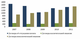 Российский рынок ИС, несмотря на значительное отставание в объемах лицензионных поступлений и платежей, в последние годы характеризуется положительной динамикой за счет увеличения количества заключаемых неисключительных лицензионных соглашений. По сравнению с 2010 г. количество заявлений о регистрации лицензионных договоров и указанных в них патентов увеличилось: по заявлениям — на 7,7% (в 2010 г.