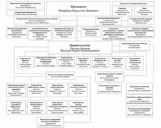 Правительство осуществляет исполнительную власть Республики Казахстан, возглавляет систему исполнительных органов и осуществляет руководство их деятельностью. Законодательные функции выполняет Парламент Республики Казахстан, который состоит из двух Палат – Сената