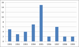 Рис.2 Динамика выхода работ, посвященных этике бизнеса, в 90-е годы ХХ века. Составлено автором.