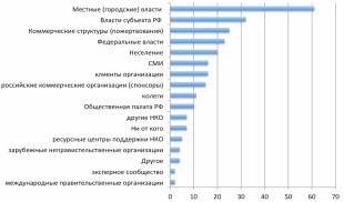 Во-вторых, противоречивым фактором являются сформированные ожидания со стороны населения в получении помощи со стороны властных структур. Согласно опросу некоммерческих организаций [92], основным ожидаемым с их стороны источником ресурсов является помощь местных органов власти: 61% опрошенных некоммерческих организаций в первую очередь ожидают поддержки от местных властей, 32% - от региональных властей, на третьем месте – помощь коммерческих структур – 25%, на четвертом – 23% - от федеральных. Помощь от международных организаций ожидается в последнюю очередь – 2% ответов респондентов (Рис. 3). С одной стороны, это негативно проявляется в виде недостаточной реализации принципа многоканальности ресурсов, что снижает экономическую эффективность фандрайзинга. С другой стороны, положительный социальный эффект в данном случае, на наш взгляд, заключается в наличии доверия к органам власти, открытости населения к взаимодействию и высоком потенциале для его эффективности.