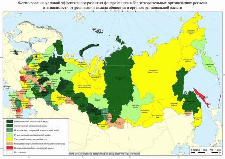 Рис. 3. Источник: составлено на основе методики, разработанной автором по результатам анализа региональных условий развития фандрайзинга в благотворительных организациях, проведенного в 2011-2014 гг. на основе официально опубликованных материалах Министерства экономического развития РФ о реализации программы поддержки социально ориентированных некоммерческих организаций.