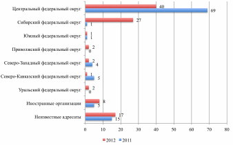 Рис. 2. Распределение получателей пожертвований в России по федеральным