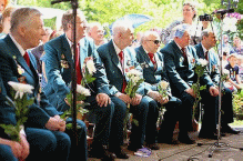 Участники Мужского Академического хора войны и труда после своего выступления слушают постановку по мотивам поэмы Александра Твардовского «Василий Теркин» учеников Свято-Петровской школы.