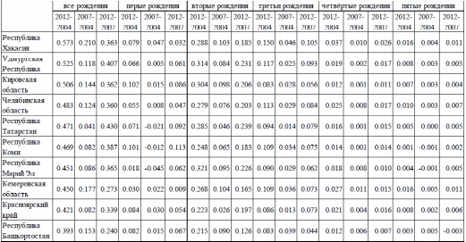 Рассмотрим подробнее, за счет каких именно рождений произошло повышение рождаемости в регионах. В таблице 2.2.1 представлены данные по 10 регионам, в которых суммарный коэффициент рождаемости вырос больше, чем в остальных регионах, в период с 2004 по 2012 год. Приведены разницы в значениях суммарных коэффициентов за три периода: с 2004 по 2012, с 2004 по 2007 и с 2007 по 2012. Согласно данным, представленным в таблице, наибольший вклад в изменение суммарного коэффициента рождаемости, рассчитанного без учета очерѐдности рождений, внес СКР по вторым рождениям. На долю первых рождений в Марий Эл приходится 71% общего увеличения СКР, в Кировской области и Татарстане – 60% общего увеличения.