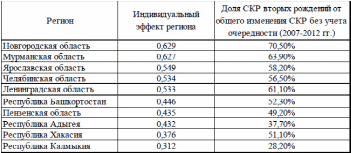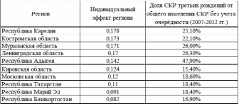 Для третьих рождений просматривается та же зависимость (см. таблицу 2.3.4). Вклад третьих рождений в прирост суммарного коэффициента рождаемости за 2007-2012 гг. для регионов с наибольшим значением индивидуальных эффектов превышает 20%.
