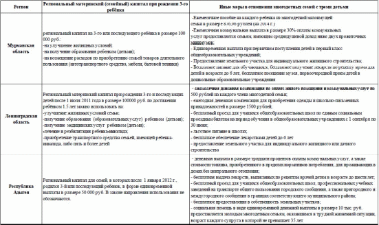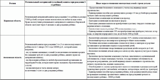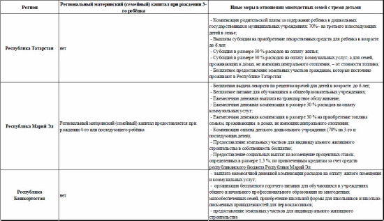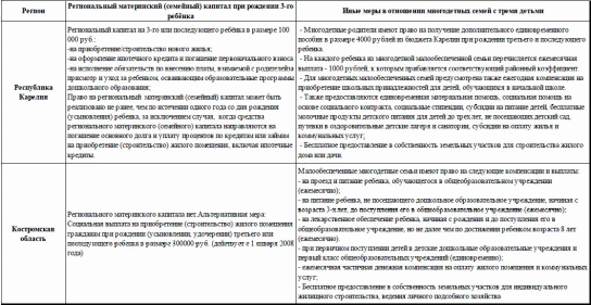 В таблицах 3.2.1 и 3.2.2 приведены основные действующие меры в отношении многодетных семей с тремя детьми в указанных регионах.