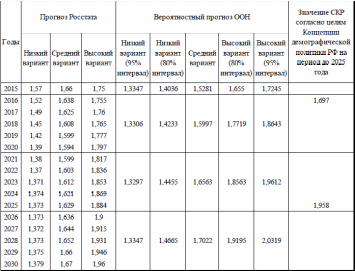 Достижение целевого значения СКР в 2016 г. (1,697 ребѐнка на одну женщину), указанного в Концепции демографического развития, возможно только при реализации высоких сценариев роста СКР, как по прогнозу Росстата, так и по прогнозу ООН. Что касается значения СКР, которое обозначено в Концепции в качестве конечной цели к 2025 (1,958), оно достижимо только при реализации высокого 95% варианта ООН. Согласно низким и средним вариантам прогноза такие значения СКР недостижимы.