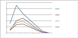 В регионах с различным уровнем рождаемости интенсивность рождения детей заметно отличается по возрастам. В нашем распоряжении имеются данные о повозрастных коэффициентах рождаемости, для примера приводим данные по 4 регионам с различными СКР (Ленинградская область