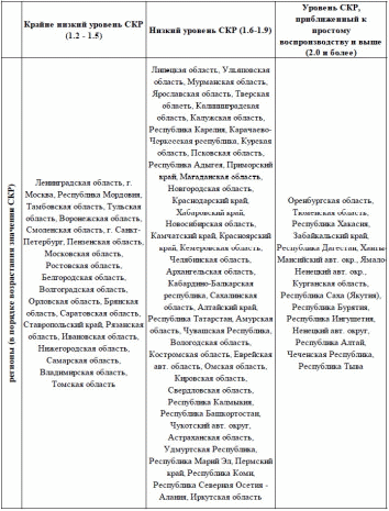 Различия суммарного коэффициента по регионам свидетельствуют о том, что субъекты РФ находятся на разных ступенях демографического перехода. И если на территориях с низким показателем второй демографический переход уже проявил себя¸ то в регионах с наиболее высоким уровнем СКР он только начался.