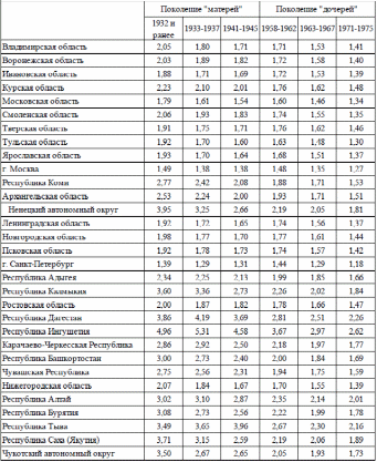 В реальных поколениях в регионах России наблюдается постепенный спад рождаемости, однако интенсивность процесса в регионах различается. Согласно данным Всероссийской переписи населения 2002 года21, быстрее всего снижение итоговой рождаемости поколений происходило в Ненецком автономном округе, Якутии, Чукотском автономном округе. Если сравнить