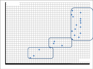 В рамках кластерного анализа для репрезентативной выборки будет выделяться четыре типа кластеров, один из которых будет показывать отклонения от кривой, которые удовлетворяют условиям исследования, поэтому его можно не учитывать при рассмотрении: кластер первого типа - компании Мега магнит, Бизнеском, Офис-персонал; кластер второго типа - Евросервис, ДЕНТ КА, Тереховский ЗБИ, КОНСАЛТ; кластер третьего типа - МПЗ Сетунь, Декорт, Лукойл, Ноутбук Сити, Новатэк, РЦ ДИС, Пасмос, МК Сочинский, Трансюг-магистраль, СИМПЭКС, Unicotrade LLC, ФЛ Луховицкий, Брянскрегионопт, Автоимпекс, Дальгидроспецстрой. Изобразим графически: