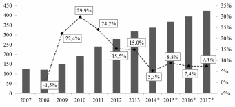 120 тыс. миллионеров. Среднегодовые темпы их прироста в период 2000–2006 гг. составляли около 15 % — один из самых высоких показателей в мире [204]. По мнению специалистов, устойчивый рост числа состоятельных лиц в России был связан со снижением инвестиционных рисков и ростом стоимости российских активов. Ввиду наступления кризиса число владельцев крупного частного капитала значительно сократилось. Так, по данным компании PricewaterhouseCoopers, к концу 2009 г. число состоятельных лиц снизилось до 100 тыс. чел., из которых услугами Private banking пользовались всего около 10 тыс. чел. В 2011–2013 гг. число владельцев крупного частного капитала в России, по экспертным оценкам, достигло показателей докризисного уровня 120–130 тыс. чел., располагающих активами общей стоимостью в 240–280 млрд долл. В 2012 г. Россия обогнала Индию по числу владельцев крупного частного капитала, в которой проживают около 126 тыс. состоятельных лиц (для сравнения в Китае проживают более 560 тыс. миллионеров). На сегодняшний день, по оценкам швейцарского банка Credit Suisse и консалтинговой компании Datamonitor, потенциал рынка ЭБО составляет более 320 млрд долл. и привлекает все новых зарубежных игроков [158]. К 2016–2017 гг. общий объем богатства состоятельных лиц в России может достигнуть более чем 420 млрд долл. при условии восстановления экономического роста. Среднегодовые темпы роста рынка в указанный период ожидаются на уровне 7 % [169]. Текущая и прогнозная динамика рынка ЭБО в России приведены на рис. 43.