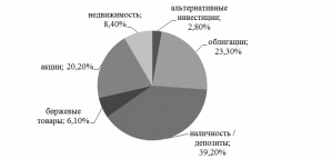 В портфелях состоятельных лиц в России большую долю занимают вложения в наличность и депозиты. Значительная доля инвестиций также приходится на ценные бумаги (акции, облигации). Примерная структура вложений российских клиентов ЭБО представлена на рис. 44.