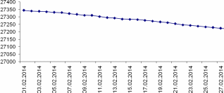 В результате наблюдений были зафиксированы значения минимальной и максимальной цен, установленных компаниями в системе Яндекс.Маркет. На графике № 9 изображена динамика минимальной цены. Стартовав с 27 334 руб. минимальная цена ежедневно снижалась, достигнув к концу месяца 27 250 руб (среднее значение составило 27 299 руб.). Данный факт является прямым доказательством того, что многие фирмы стремятся установить цены на низком уровне, для того, чтобы попасть в ТОП самых выгодных предложений. В ходе наблюдений было отмечено, что ежедневно цена снижаась на незначительную величину (2-5 рублей) и каждый день происходила смена компании, предложившей минимальную цену. Таким образом, подтверждаются тезисы о том, что в Интернете гораздо проще изменять цены, между компаниями существует значительная ценовая конкуренция, приводящая к понижению цен, при этом шаг этих изменений незначителен.