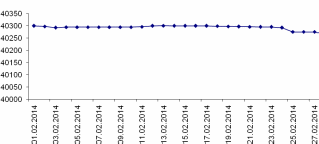 Максимальная цена, предлагаемая Интернет-магазинами в системе Яндекс.Маркет (см. график № 10) продемонстрировала наименьшее снижение в течение рассматриваемого периода (на 35 руб. с 40 300 руб. до 40 265 руб.). При этом в течение рассматриваемого периода максимальная цена, как росла, так и снижалась, а также не изменялась. Ее среднее значение составило 40 285 руб. Стоит отметить, что компаний, реализующих товар по максимальным ценам, немного. При сортировке ценовых предложений от максимального к минимальному цена уже десятого Интернет-магазина (из более чем 300) на 5000 рублей ниже самого дорогого.
